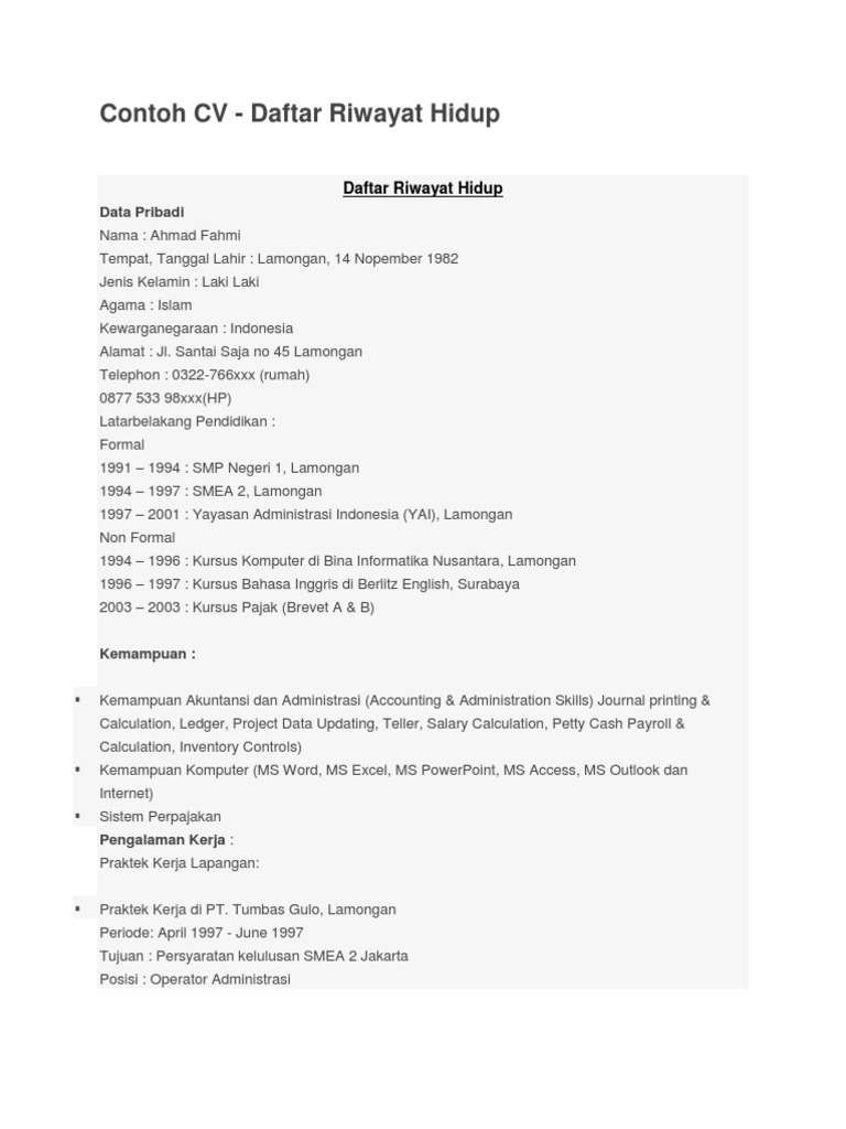 Berikan informasi yang jelas mengenai data diri anda, pastikan seluruh informasi yang anda berikan asli, isi nama contoh cv word. Pada artikel ini, kami akan membahas secara lengkap mengenai contoh cv lamaran kerja yang baik dan benar, contoh format cv yang bagus dan masih banyak lagi yang akan kami bahas.